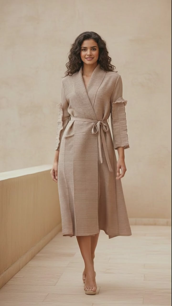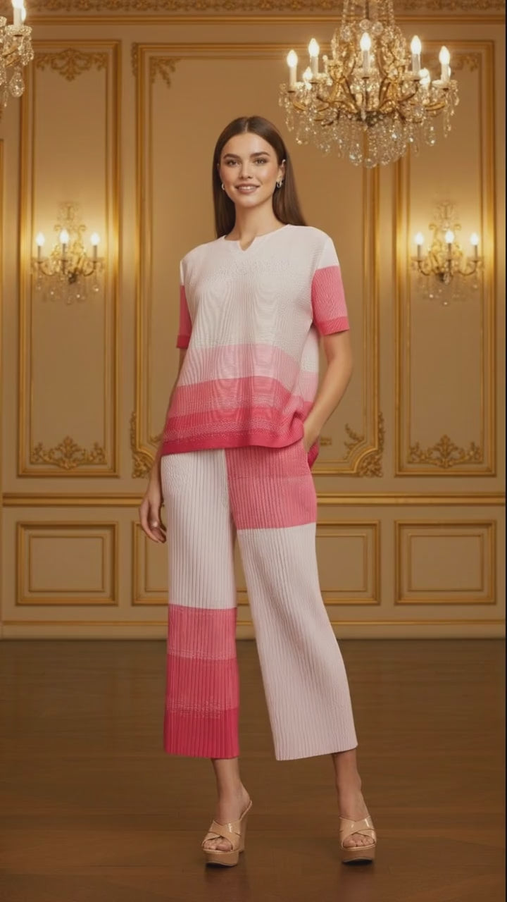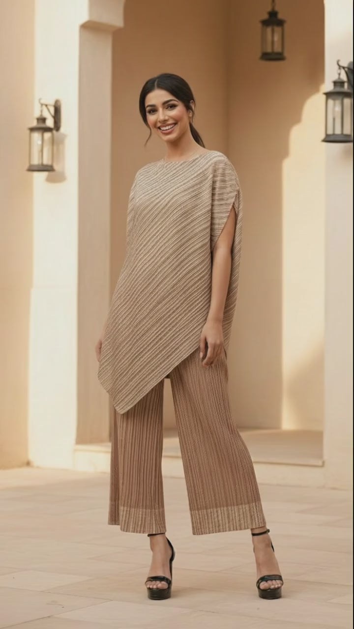 Polyester Metallic Pleated Top And Pant Set - Beige