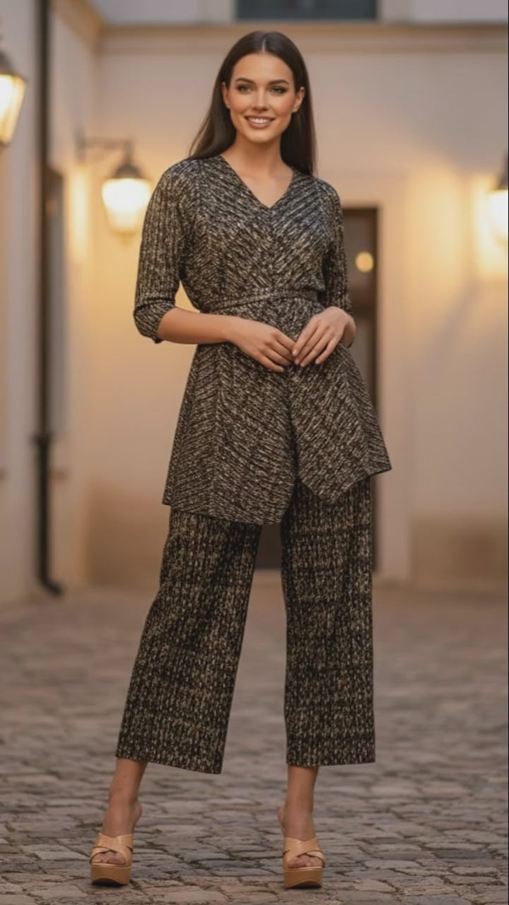 Gold Polyester Metallic Pleated Top And Pant Set - Black