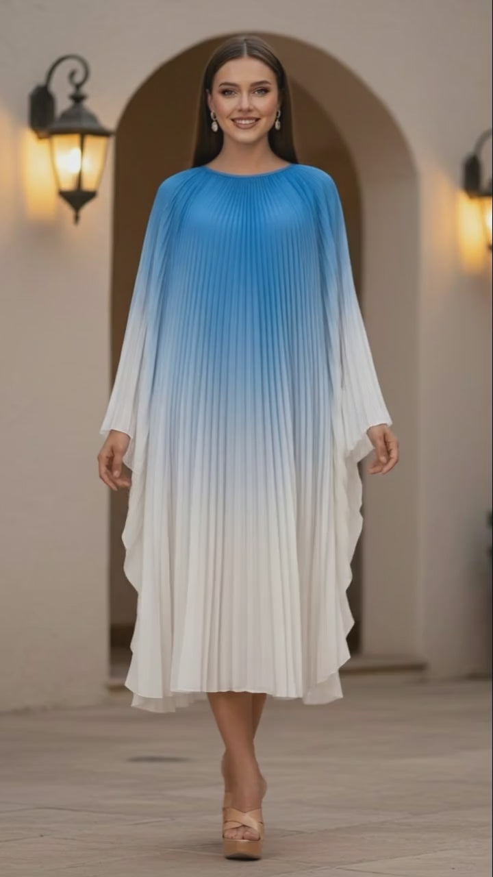 Pleated Gradual Color Dress Irregular O-neck Long Sleeves Loose Long - Blue