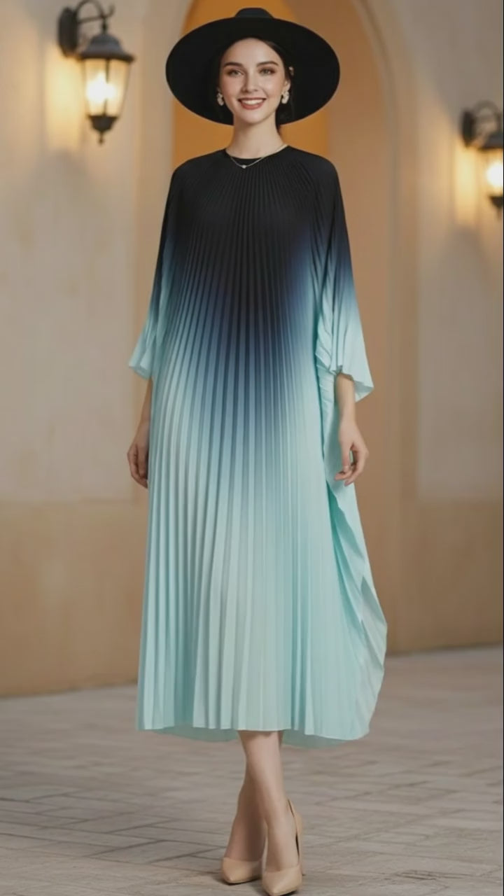 Pleated Gradual Color Dress Irregular O-neck Long Sleeves Loose Long -Dark Grey