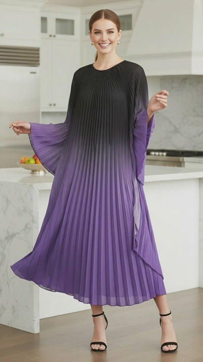 Pleated Gradual Color Dress Irregular O-neck Long Sleeves Loose Long - Purple