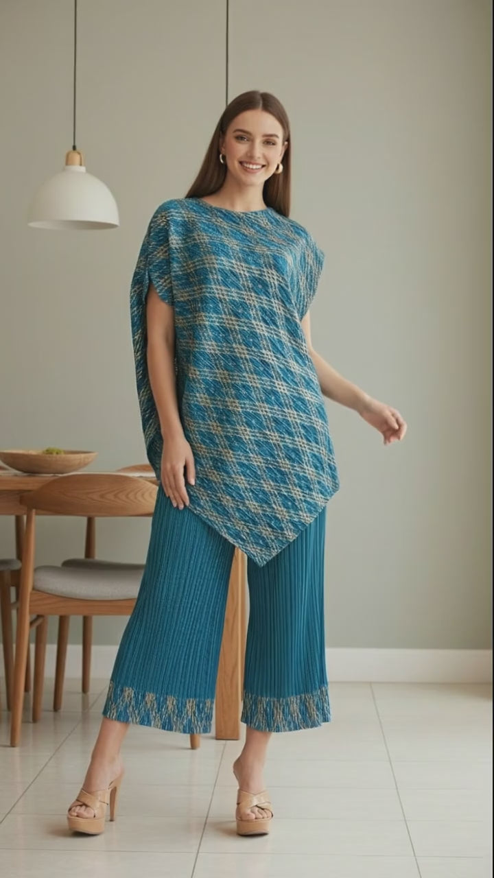 Polyester Metallic Pleated Top And Pant Set - Blue