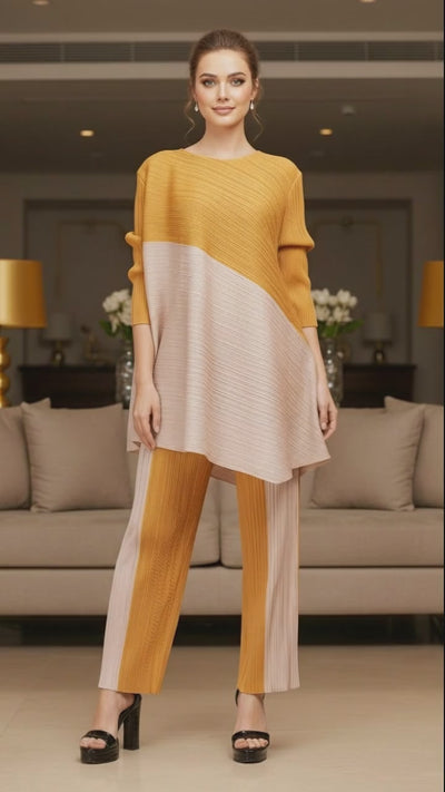 Top Loose Mild Pleated Stretching Skirt Two Pieces Set - Yellow